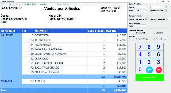 Obtenga reportes mensuales, por fechas, por garzon, por mesas, etc. Agrupe ventas por productos o familias de productos, seleccione a gusto parametros a considerar en las estadisticas y vea los datos que siempre ha querido ver. Reciba un mail con las estadisticas de cierre de caja y personalice las estadisticas que desea recibir. Todas nuestras interfaces de estadisticas puede exportarlas en formato .PDF o .XLSX (MS Excel), son fáciles de usar y las podrá personalizar a su gusto, adaptandose tanto a un pequeño local, como a una gran cadena de restoranes.